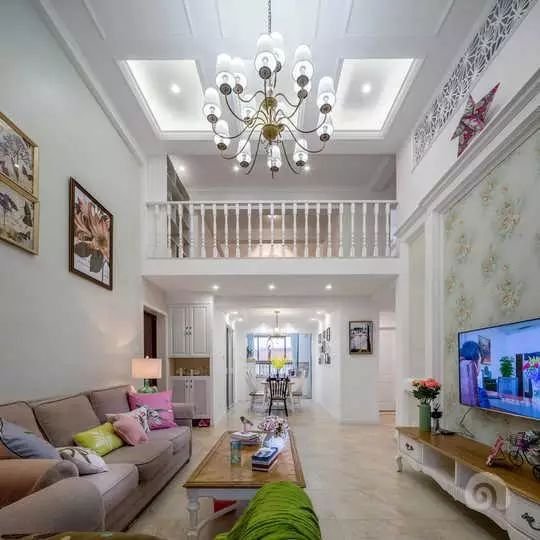 这120平米的复式从客厅的角度看上去非常的大气,整个空间采用白色为主色调,大气的吊灯搭配上各种石膏线,整个空间显得大气而不失文雅。