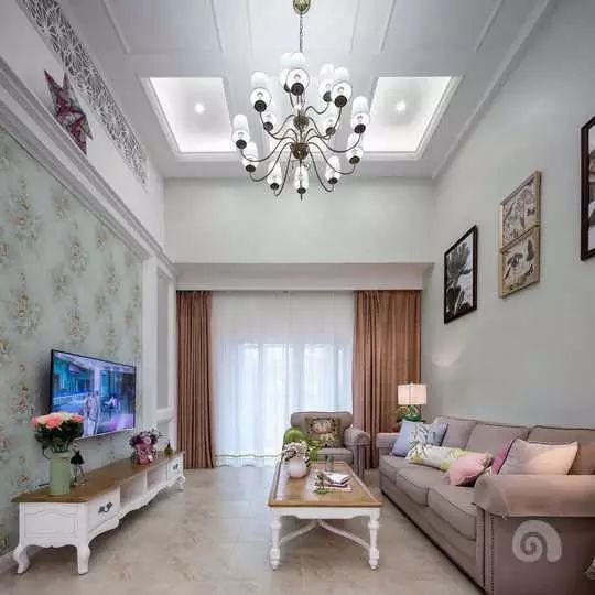 一个大气的美式风格的吊灯,增添了整个空间的大气感,沙发背景采用淡淡的绿色作为背景色,给人一种清新脱俗的感觉,沙发茶几都是选用比较简单的样式,减少了空间复杂感,给人感官很清爽。