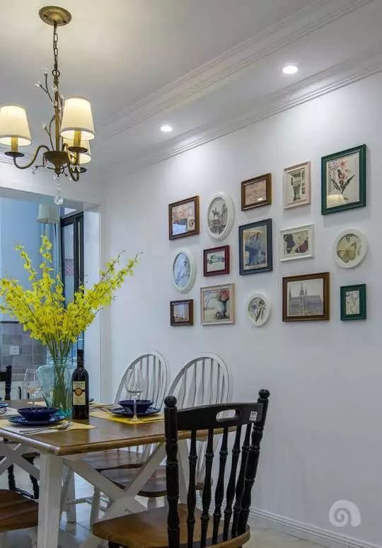 餐桌上的搭配给人一种诗情画意的感觉,复古的吊灯和挂画搭配上清新脱俗的插花,整个空间看上去非常的文雅。