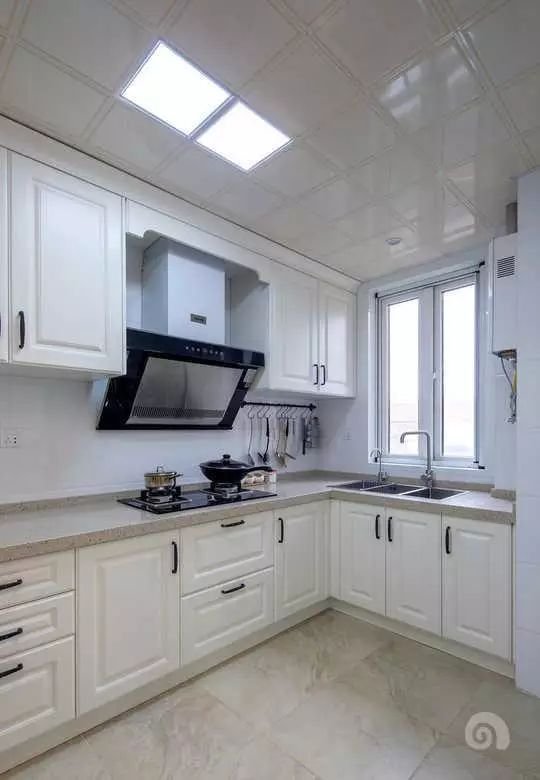 厨房采用的是半开放式的厨房,给原本不是很大的厨房一点视觉错觉,显得很大气。厨房整个色调以白色为主,空间看上去很清爽干净