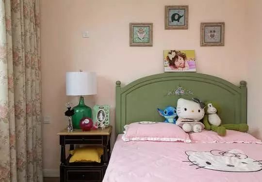 儿童房的背景上的挂画看上去还是显得比较的可爱,搭配上复古但是造型又有点可爱的床,更显得整个空间的活跃感,跳动感。