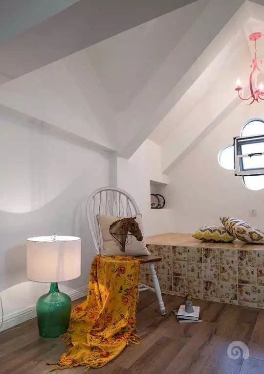 马头图案的抱枕,复古色调的榻榻米,整个空间软装搭配的非常的文艺气息。
