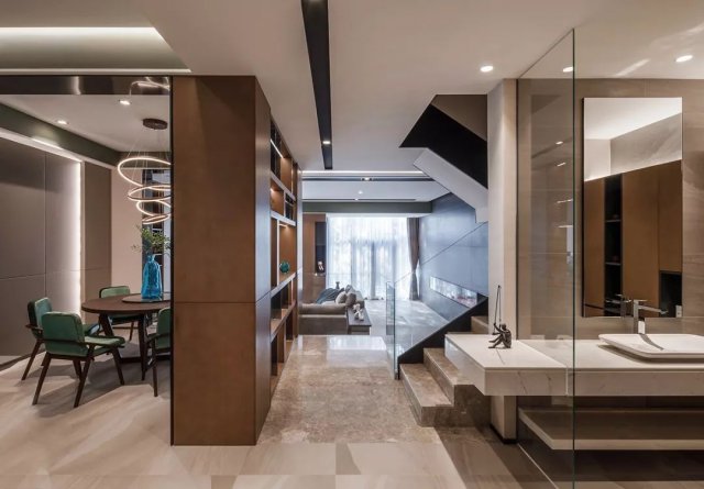 从入户的大门进入空间,入户的鞋帽柜穿插着展示功能的开放搁架,主人的收藏品从一进门的开始就可以展示。右手边卫生间干区的台面悬挑出来,被一面玻璃从中切割,形成独特的穿插美学。左手边的中厨,开放式西厨和餐厅一字排开,在中厨和过道之间,设计师结合原建筑的“L”形柱,用木作和深色玻璃打造了一面展示隔断,在视觉和空间上围合了餐厅区域,使之更具围合的聚合感。沿着过道来到一层的中心客厅,这里的下沉结构设计师将楼梯进行多层次的艺术化处理,使之更具有韵律的雕塑美感,将客厅和阳台打通,获得更为宽敞的视觉和空间效果,但随之而来的一根承重柱则在客厅暴露出来,这里设计师将柱子的形态进行了重新设计,使它具有重点展示功能,KAWS的解剖玩偶放置这里,时尚而新颖。电视墙的设计则依靠了空间的层高优势布置了通高的展示架,在光影交错中演绎了精致而纯粹的美学。