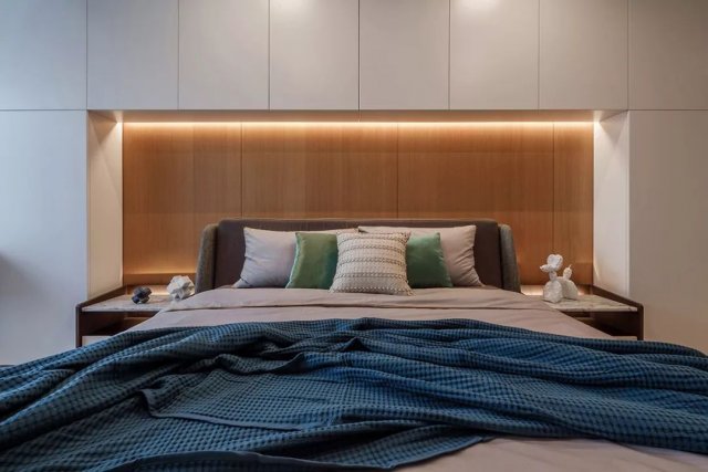 二层的主卧空间,将其原北阳台纳入其中扩大使用空间,同时床头一边有个承重柱,这里设计师用白色的柜体将其包裹,依次将入门的玄关,睡卧的床体,和阅读的书桌依次有序串联起来,形成统一而富有韵律的视觉效果,丰富了储藏又解决了承重柱的美观问题。